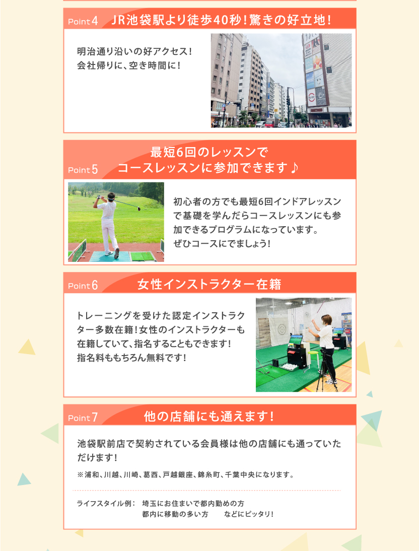 難しいゴルフ用語を使わず、ボディータッチも一切せず、初心者の方のために特化した分かりやすい説明によってどんな方でも簡単にコースデビューに導く優しくて、清潔なインストラクターばかりです♪詳しくはインストラクターページからどうぞ