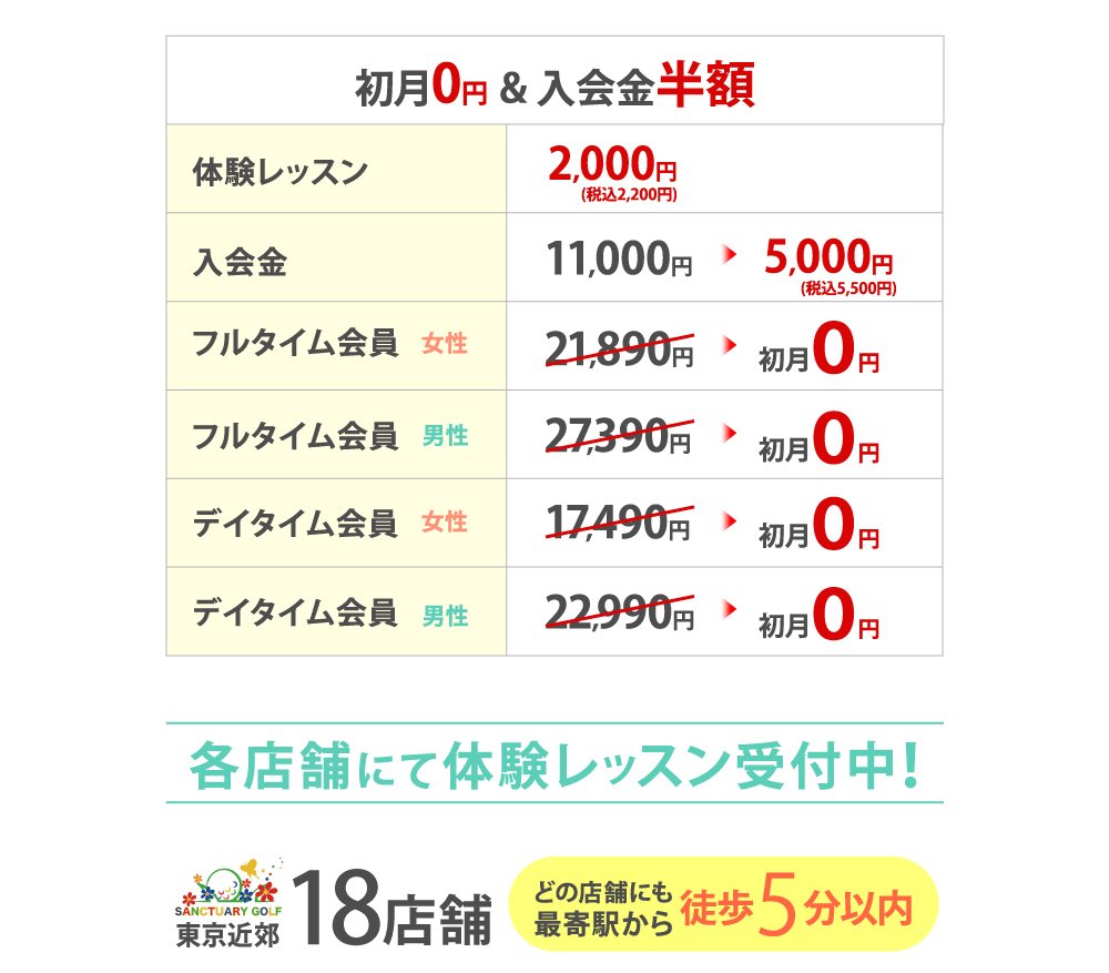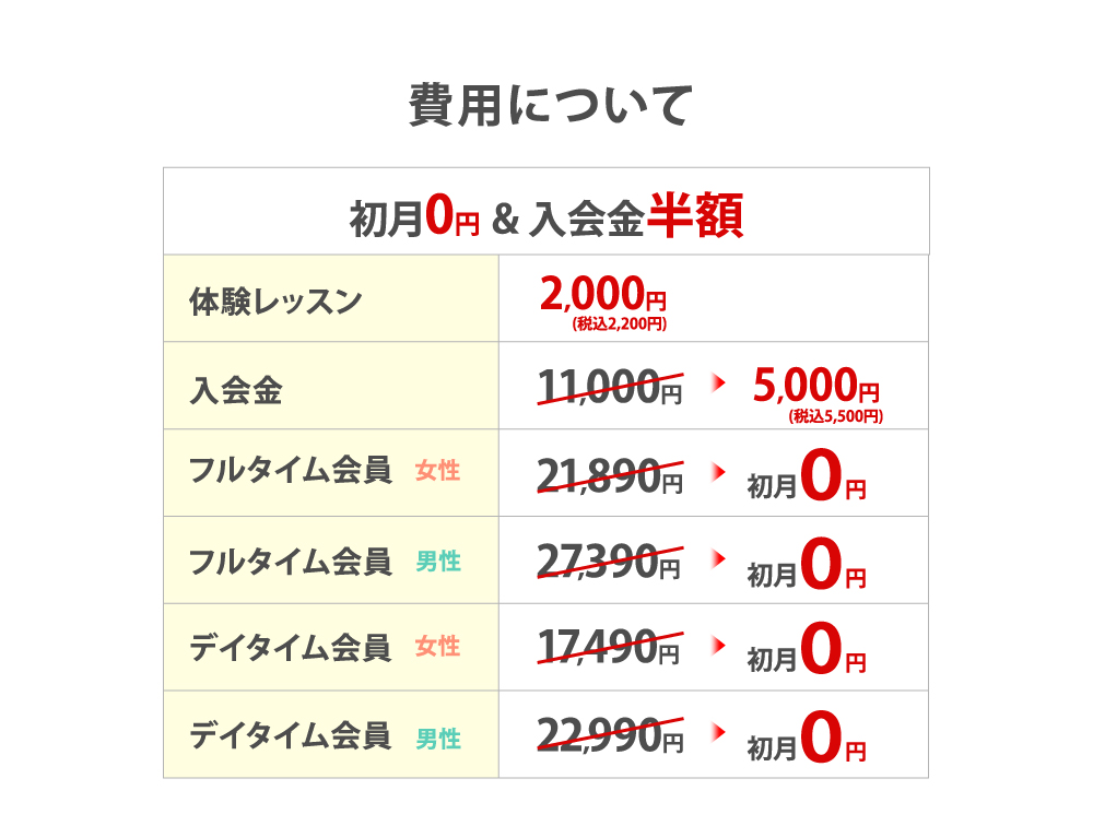 全店舗共通会員サービスをご利用いただくことで、どの店舗でもレッスンが受けられます!月会費に+5,000円(税抜)で変更可能です。詳細については、店舗フロントまで。