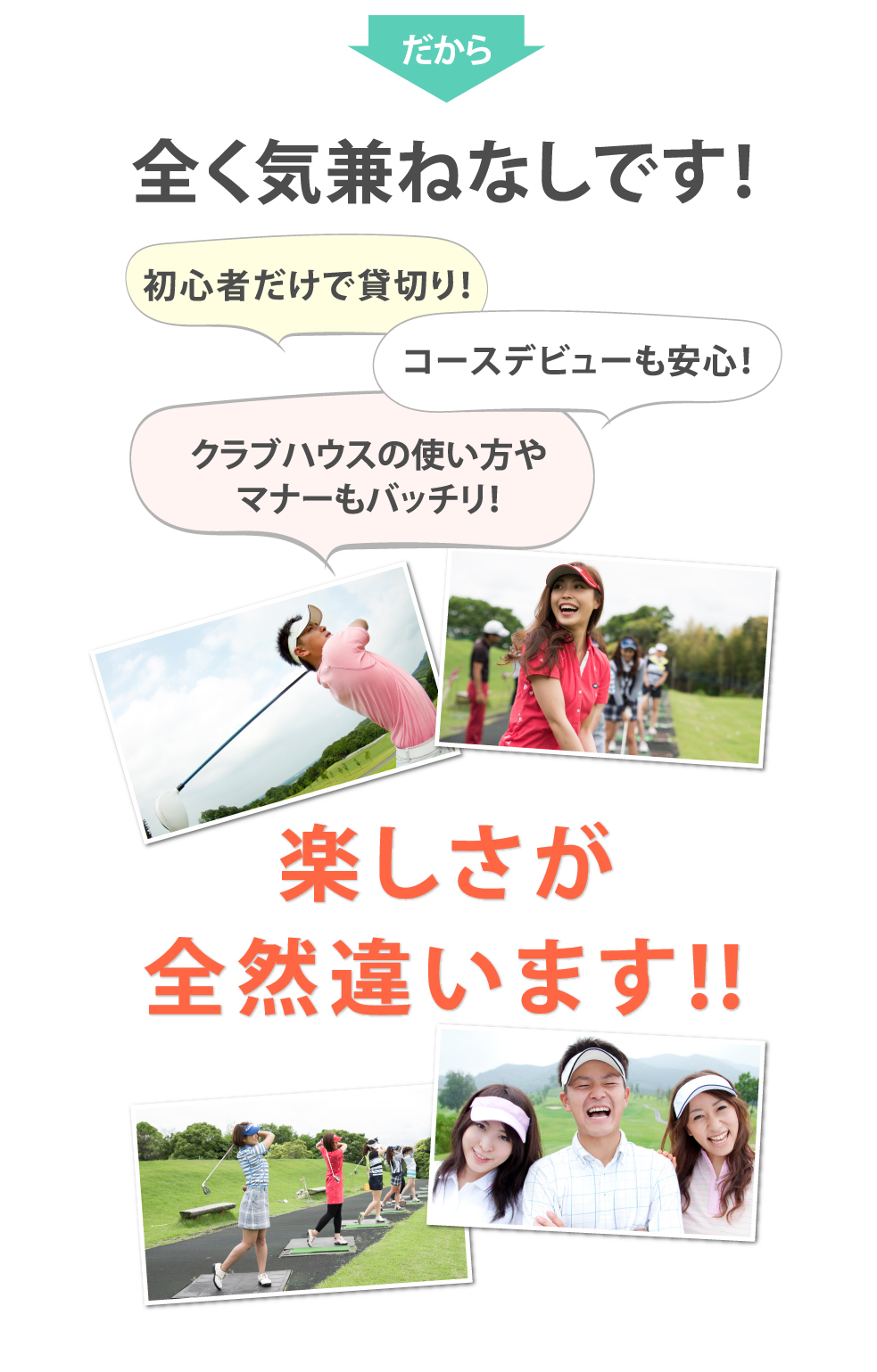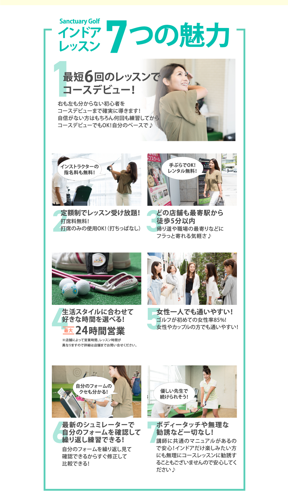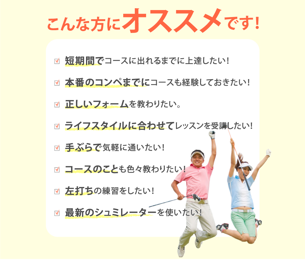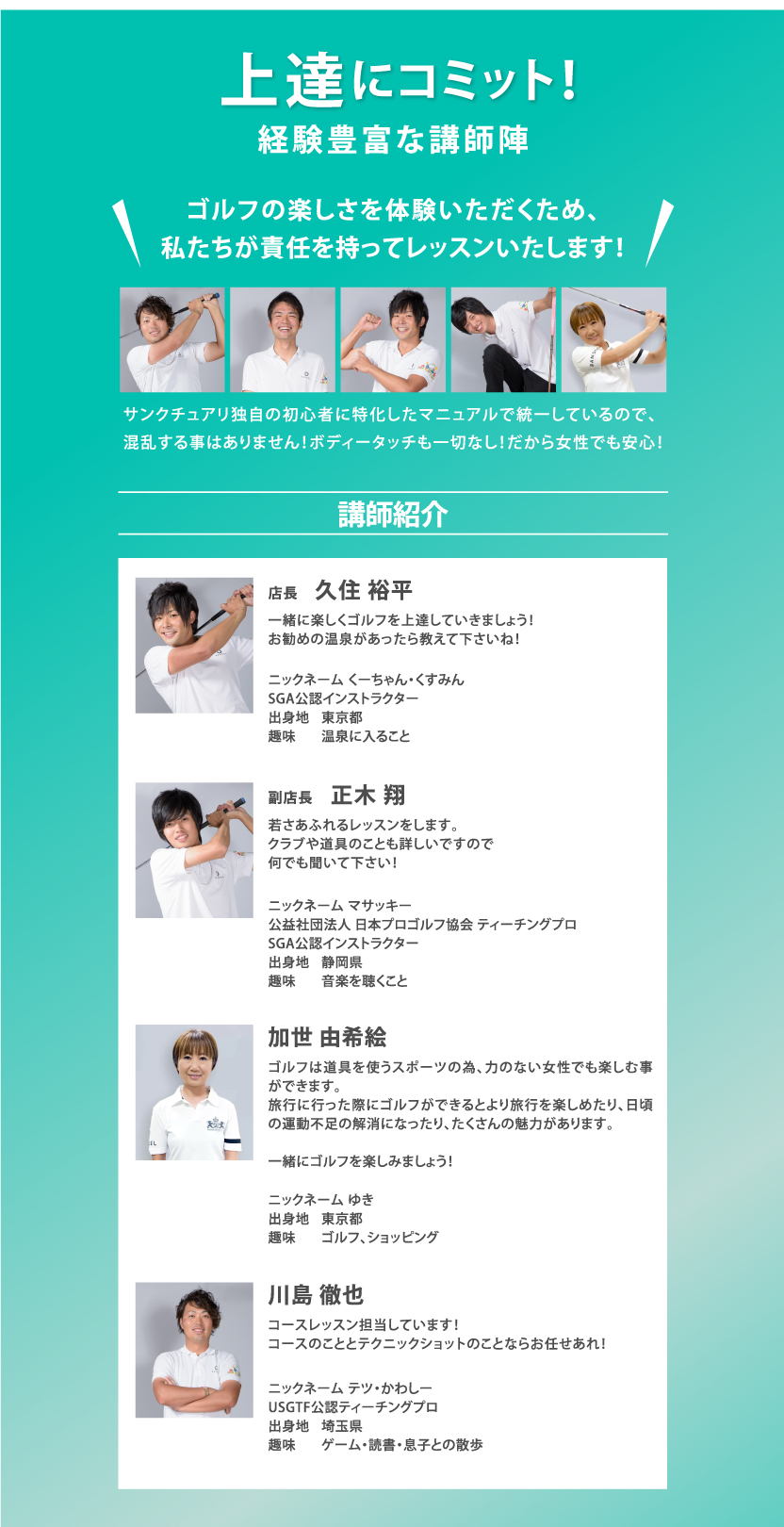 難しいゴルフ用語を使わず、ボディータッチも一切せず、初心者の方のために特化した分かりやすい説明によってどんな方でも簡単にコースデビューに導く優しくて、清潔なインストラクターばかりです♪詳しくはインストラクターページからどうぞ