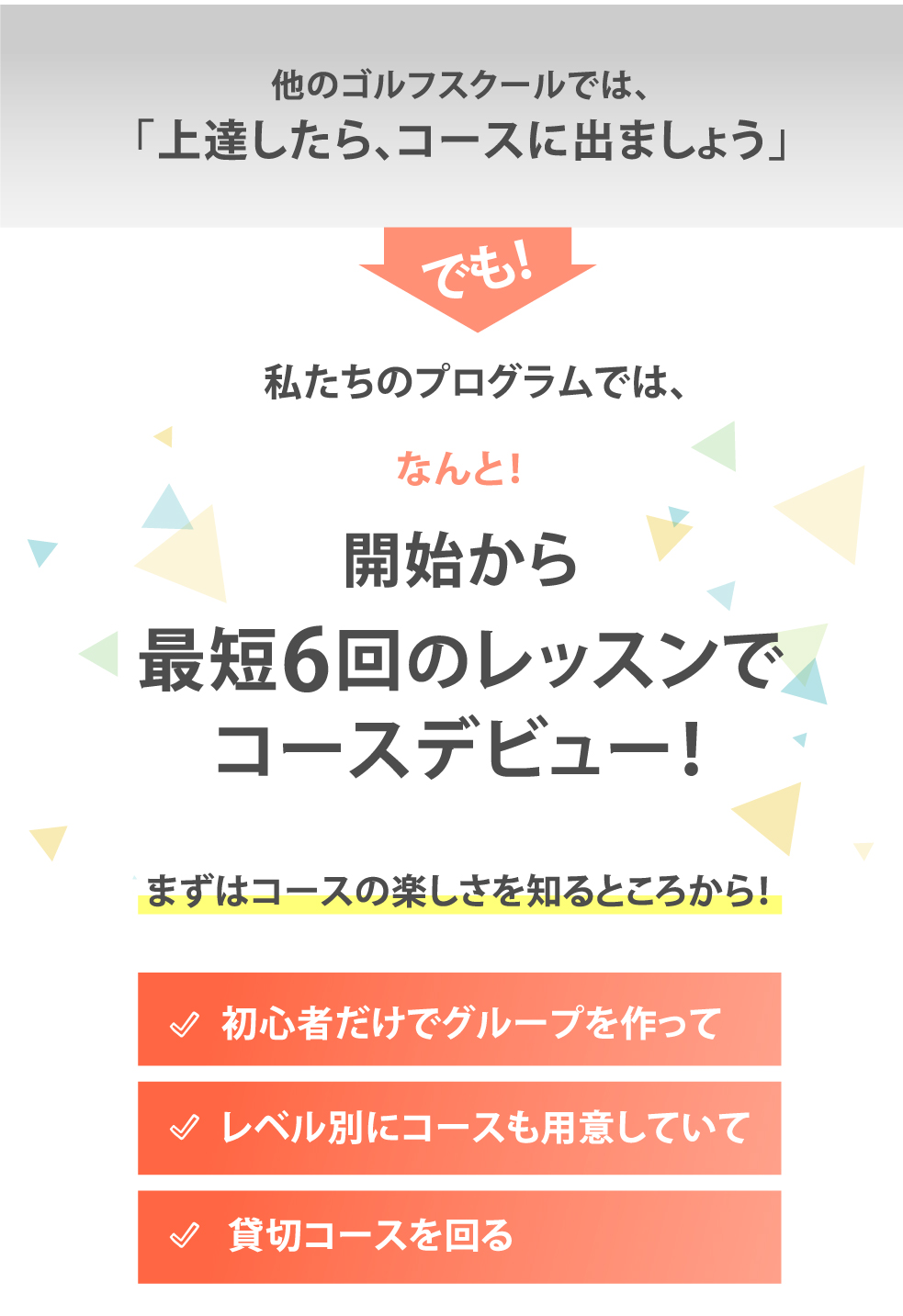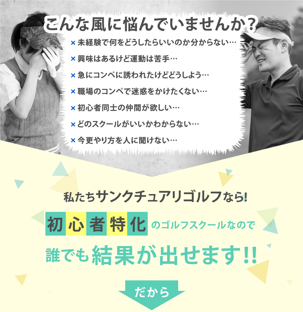 私達は初心者専用のゴルフスクールなので、運動が苦手なゴルフ未経験の方でも問題なく上手になれる独自のレッスン方法があります!ゴルフをした事がない女性をコースデビューさせた実績があるんです(*^_^*)