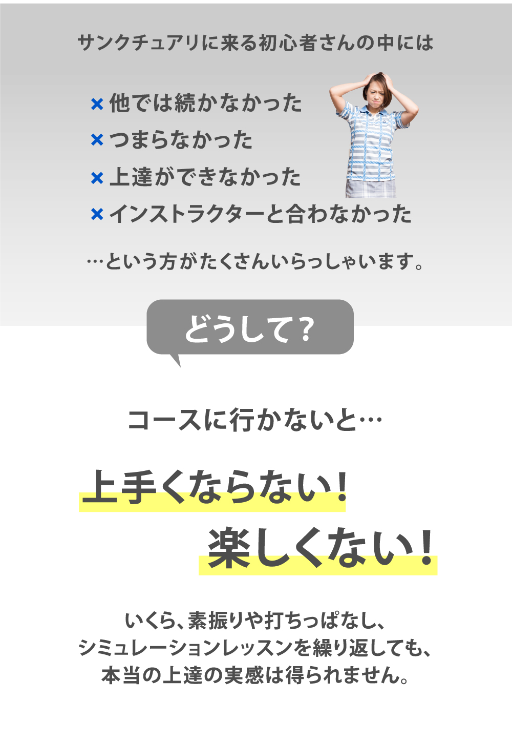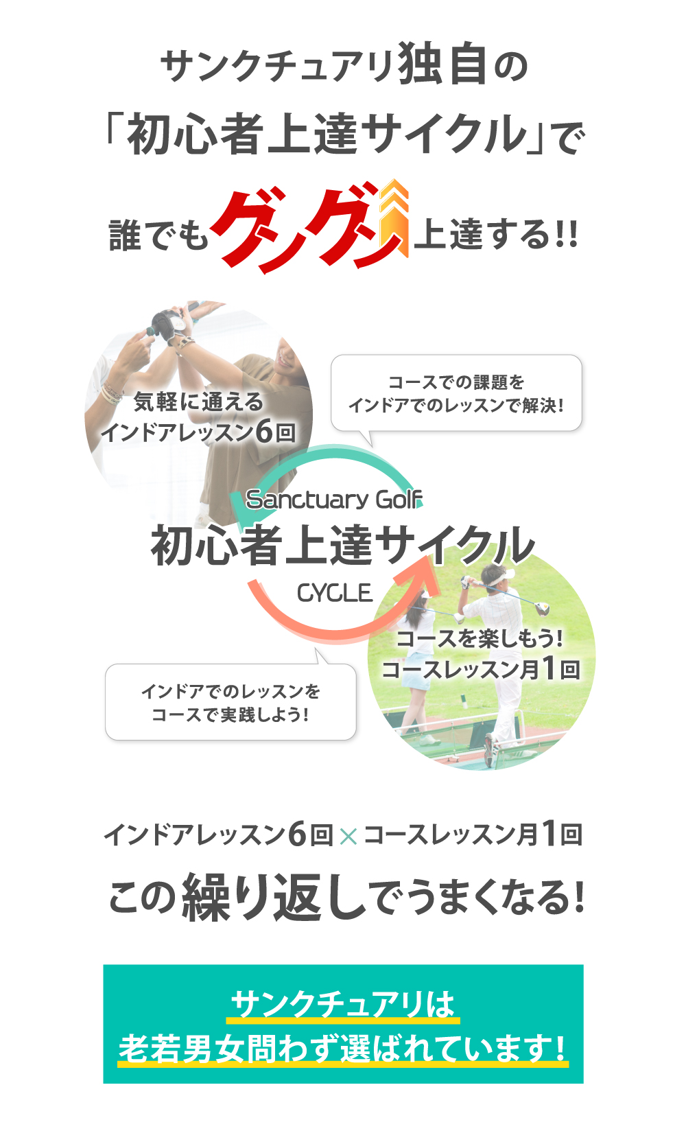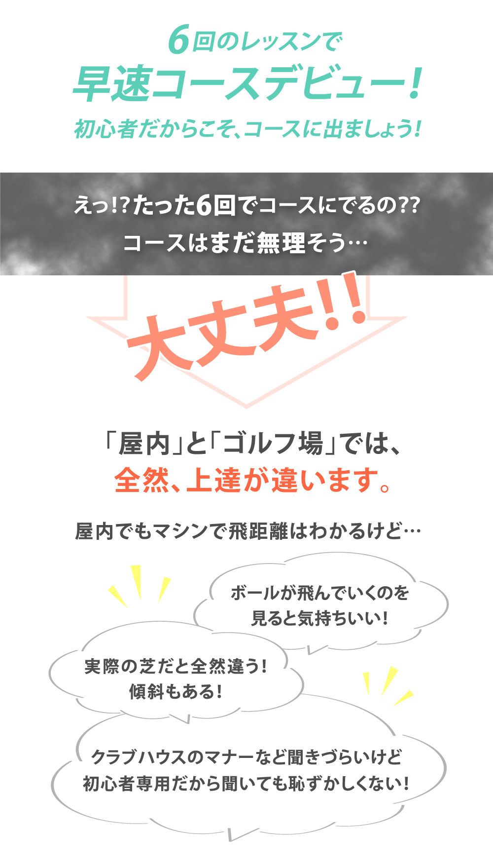 インドアレッスンでも十分に上達は出来ます!ただ、上達への一番の近道は、インドアで基礎を学んでからコースレッスンで課題をみつけ、インドアレッスンでその課題を克服するサイクルが一番の上達への近道です!サンクチュアリは初心者専用ゴルフスクールなのでゴルフをしたことがない方の最短の上達方法をどこよりも熟知しています。