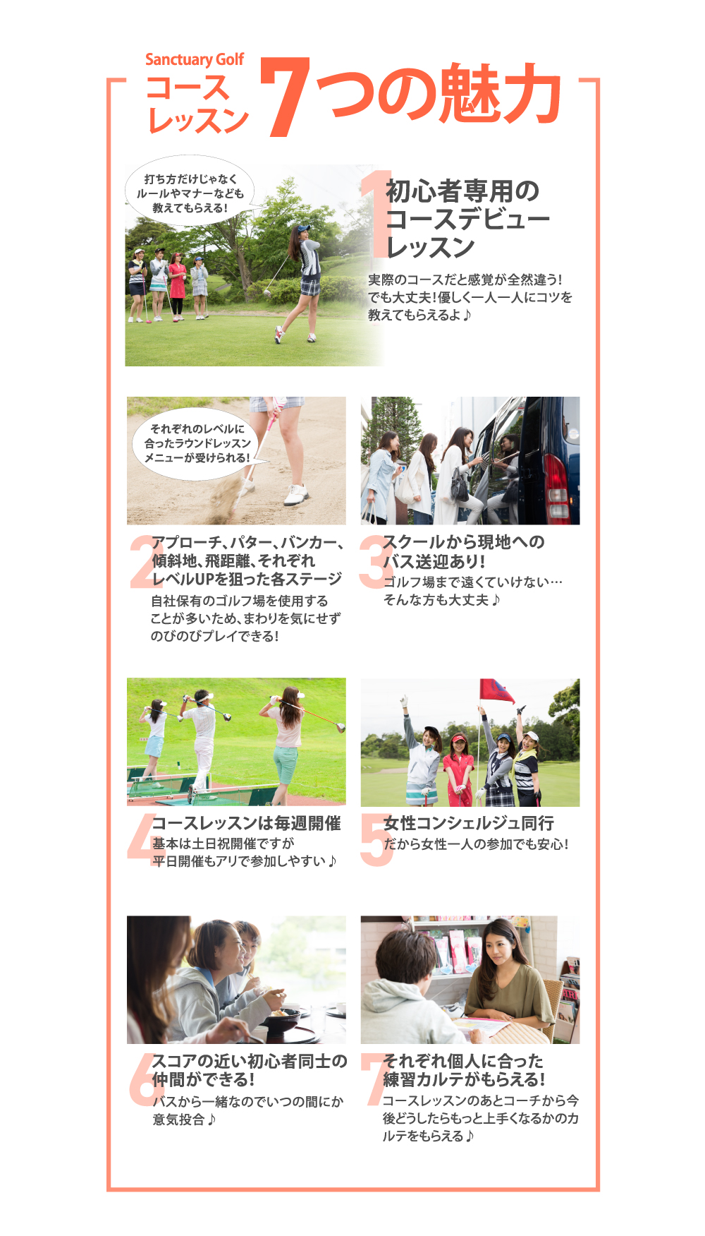 女性フロントスタッフが帯同し皆様のサポートをさせていただきますのでご安心ください!また、サンクチュアリは女性会員様が85%以上を占めており、女性一人参加の方が非常に多く、なおかつ皆様ゴルフ初心者という共通点があるのでお友達が作りやすい環境になっております♪(一組あたり、4人~8人で回ります。一緒の組になった会員様で女子会をしたり、飲み会をしたり…というお話もよく聞きますよ♪)