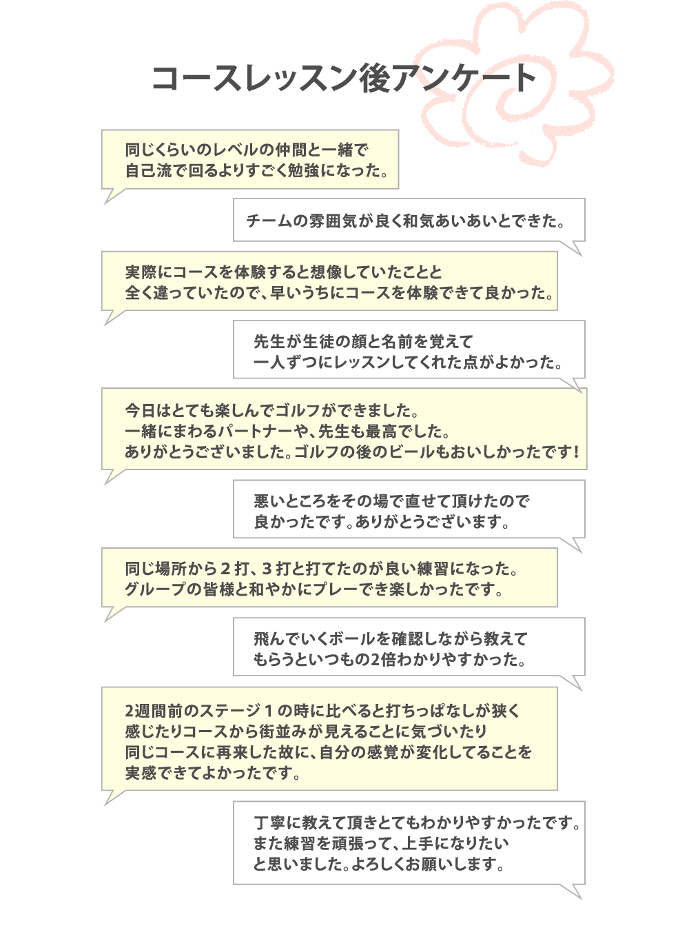 コースに行った事のない方専用のコースレッスン(ステージ1)をご用意しておりますので、ご安心下さい。