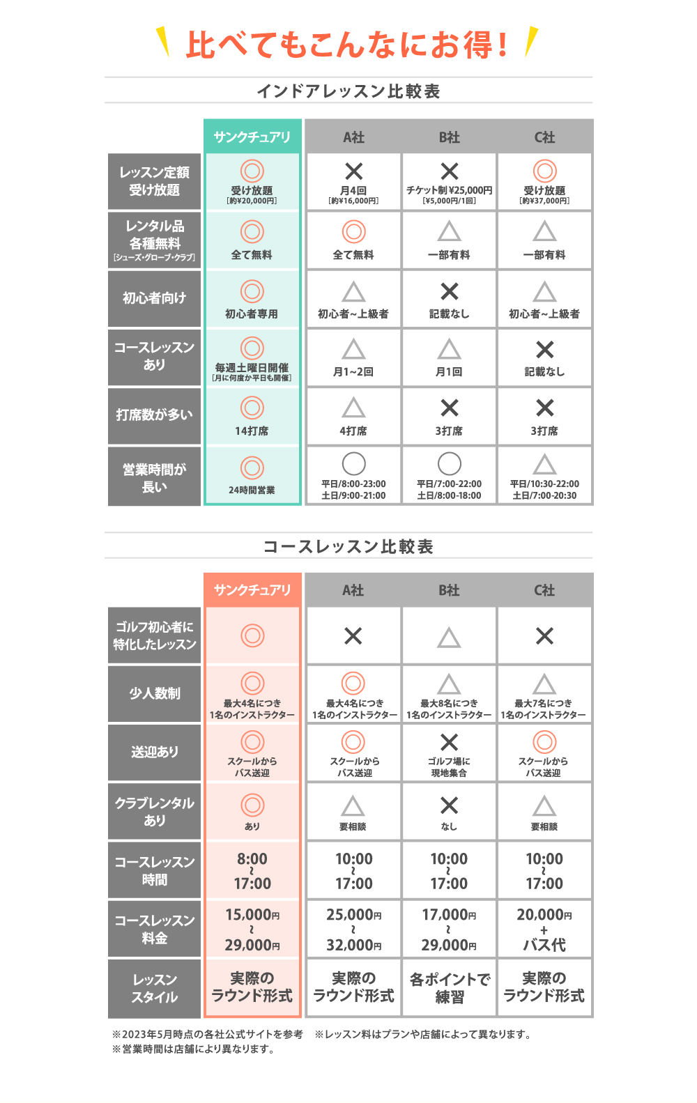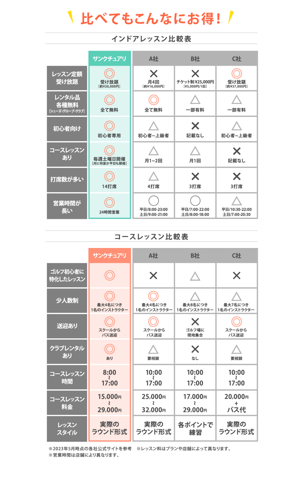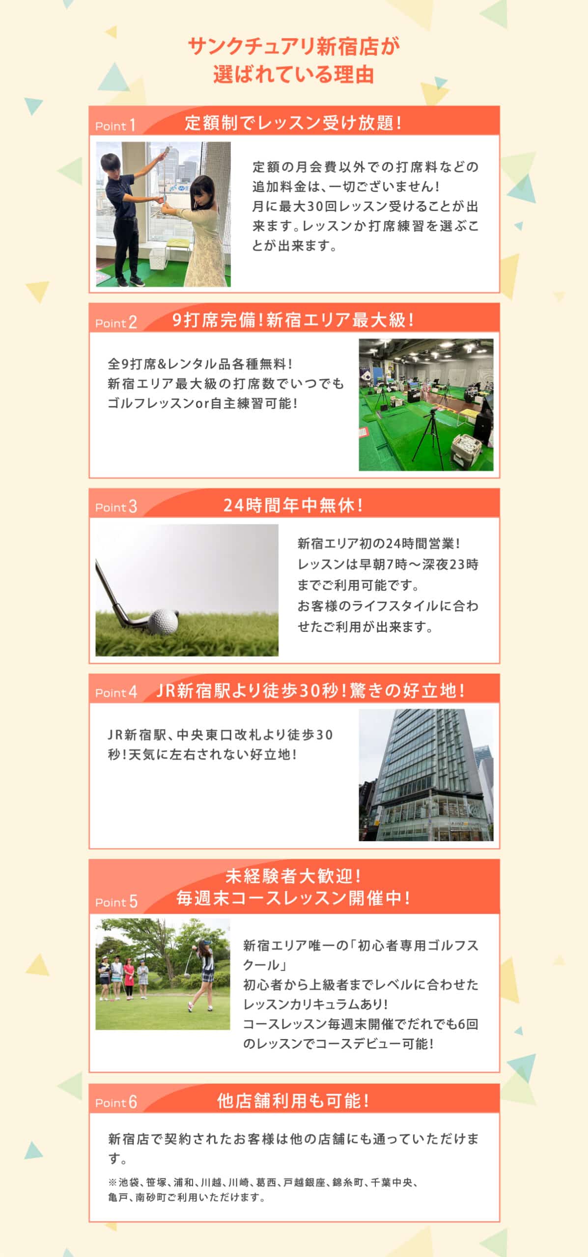 これまで8,000人以上をコースデビューさせた実績のあるサンクチュアリ独自の初心者に特化したマニュアルで統一しているので、混乱する事はありませんよ!また日々の中でインストラクター会議を重ね、会員様により良いレッスンが提供出来る様に日々改善しています!